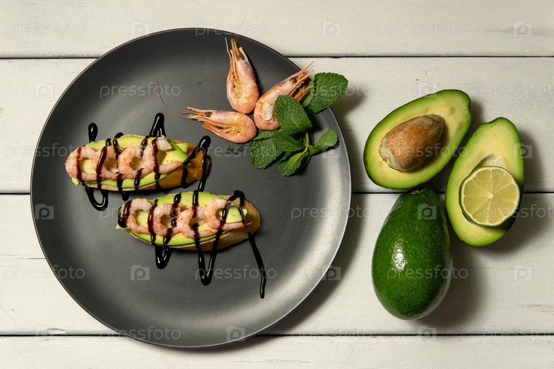 Брусчетта с креветками, авокадо и лаймом на белом деревянном фоне