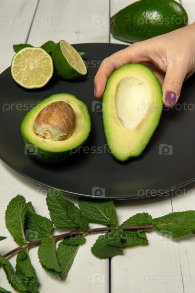 Женщина готовит сырой авокадо и лайм на белом деревянном бэкгроунге