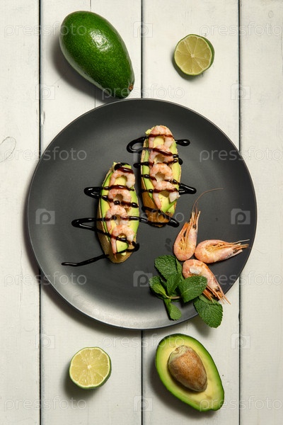 Брусчетта с креветками, авокадо и лаймом на белом деревянном фоне
