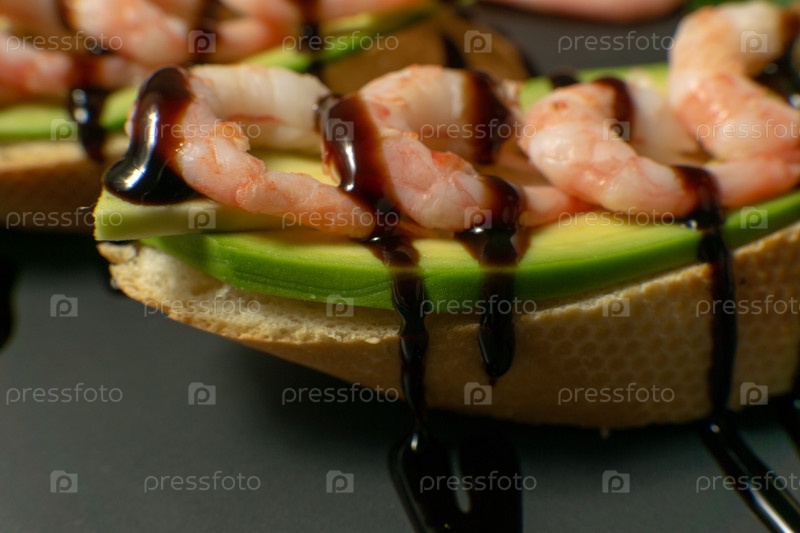 Брусчетта с креветками, авокадо и лаймом на тарелке