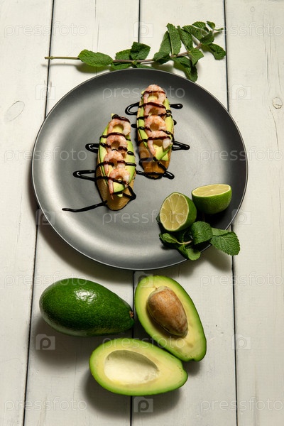 Брусчетта с креветками, авокадо и лаймом на белом деревянном фоне