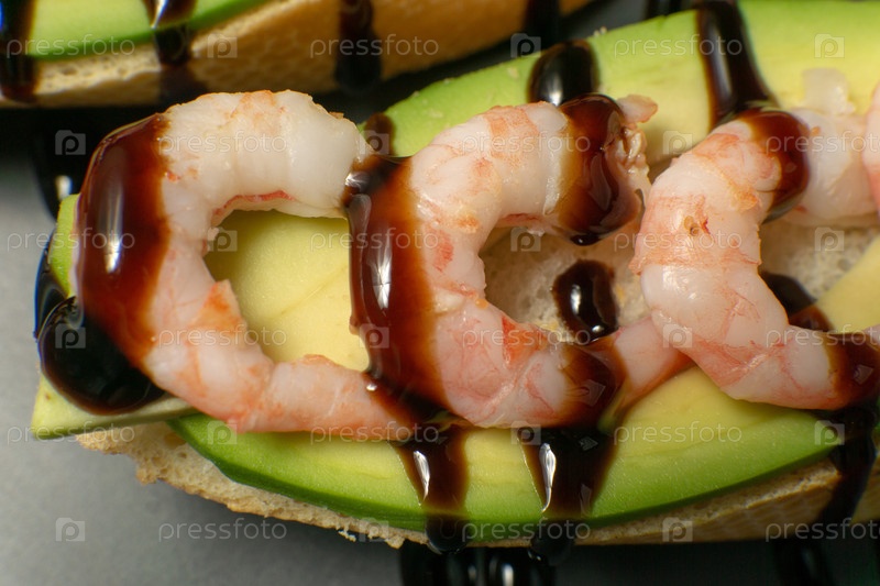 Брусчетта с креветками, авокадо и лаймом на тарелке