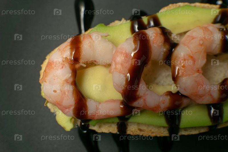 Брусчетта с креветками, авокадо и лаймом на тарелке