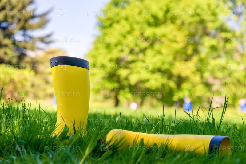 Две желтые резиновые сапоги на зеленом сочном газоне в весенний полдень