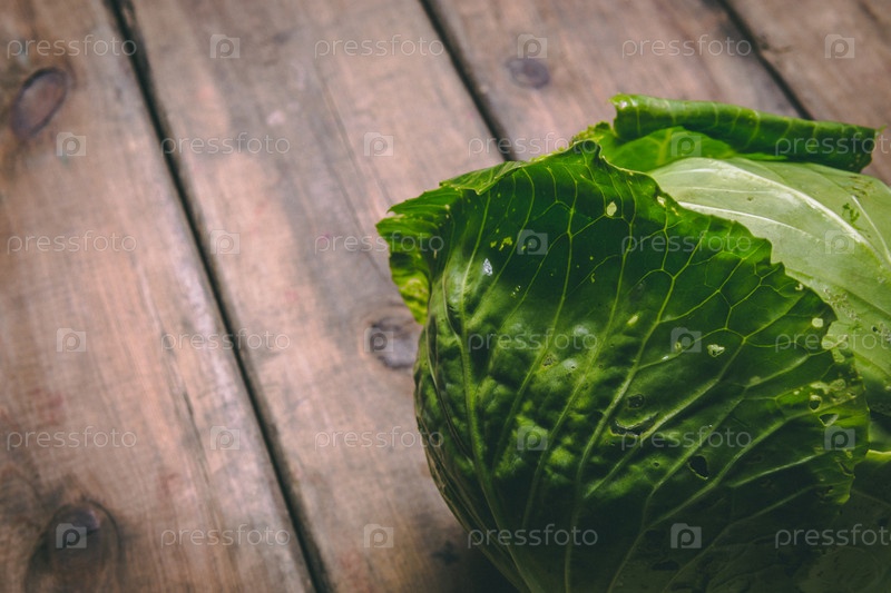 Свежая капуста на деревянном деревенском столе. Копируйте пространство. Здоровая еда. Сырые овощи