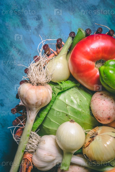 Помидор, капуста, лук, картофель, перец, чеснок, морковь и свекла. Овощи в корзине на синем фоне. Копируйте пространство. Здоровая еда