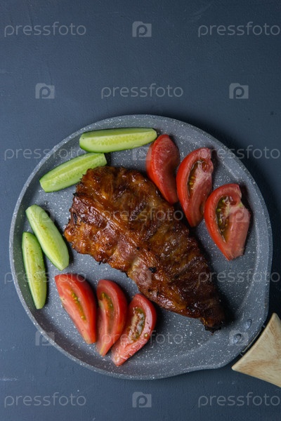Запеченные свиные ребра с медом лежат со свежими нарезанными помидорами и огурцами на темно-серой бетонной столешнице