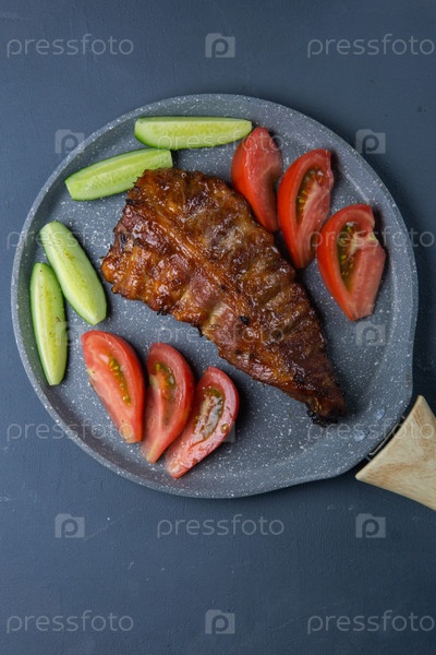 Запеченные свиные ребра с медом лежат со свежими нарезанными помидорами и огурцами на темно-серой бетонной столешнице
