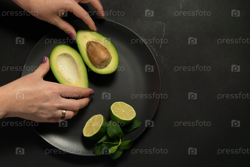 Женщина готовит сырой авокадо и лайм на темном заднем канаве
