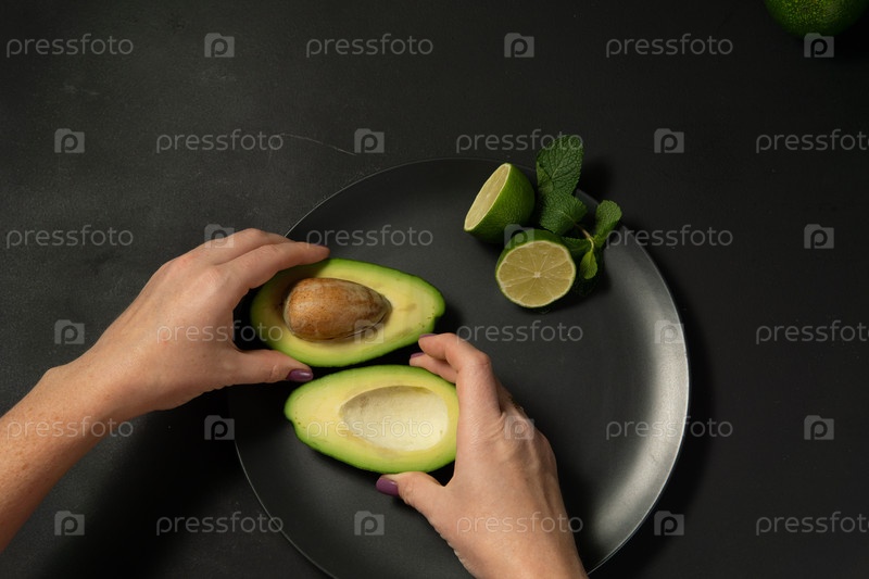 Женщина готовит сырой авокадо и лайм на темном заднем канаве