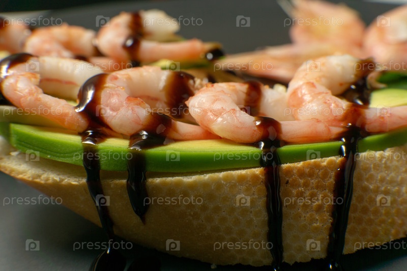 Брусчетта с креветками, авокадо и лаймом на тарелке