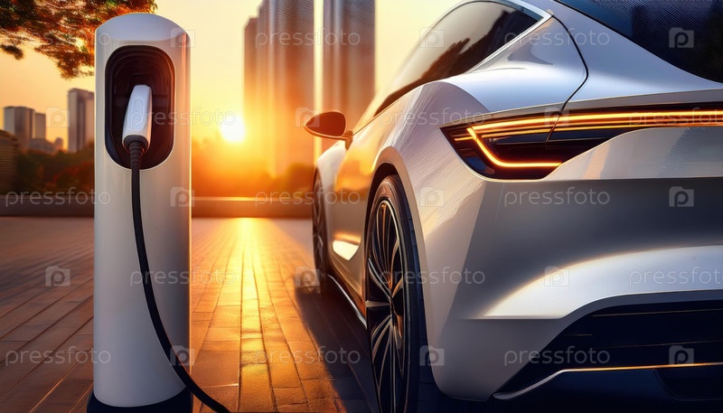 Электрический автомобиль подключен к зарядной станции на закате с городским горизонтом на заднем плане