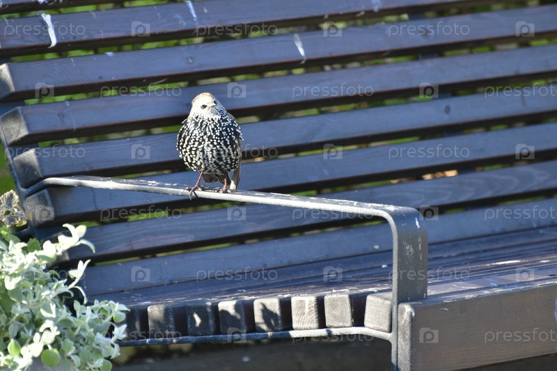 Пятнистый скворец на скамье