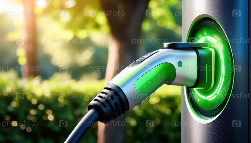 Зарядная вилка для электромобилей подключена к зеленой энергетической станции в парковой среде в солнечный день