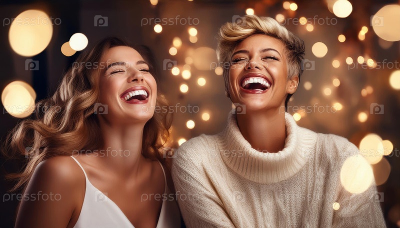 Две радостные женщины смеются вместе с теплыми светящимися боке на заднем плане, захватывая дружбу и счастье