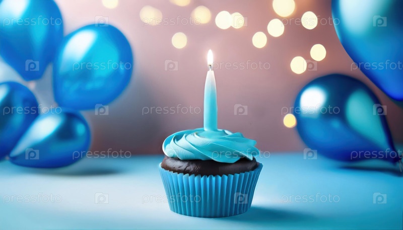 Один шоколадный кекс с синим морозом и свечой, установленный на праздничном фоне для празднования гендерной вечеринки