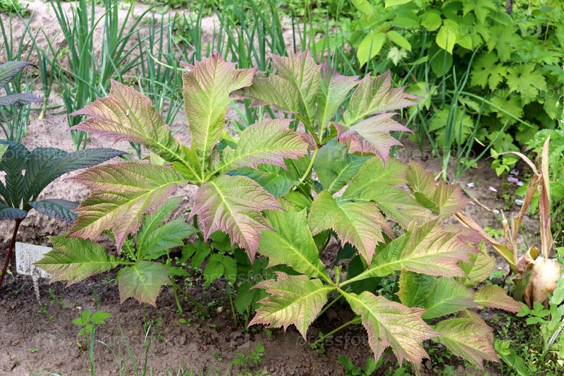 Декоративный кустарник роджерсия, молодое растение рядом с луковой грядкой в саду в летний день