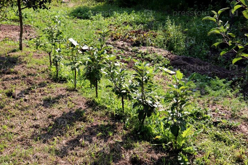 Ряд, аллея молодых яблонь в саду в летний день