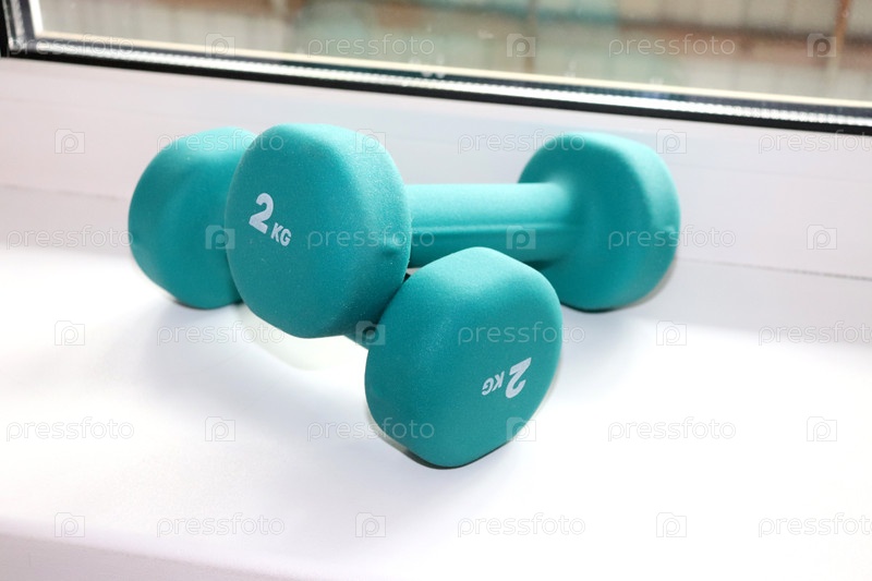 Две двухкилограммовые бирюзовые гантели лежат друг на друге на подоконнике, крупный план