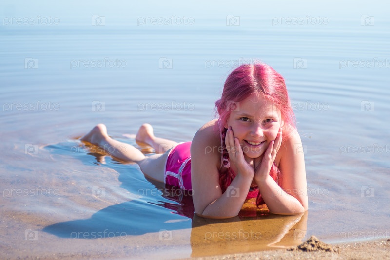 Девочка с розовыми волосами отдыхает на озере в жаркий летний день