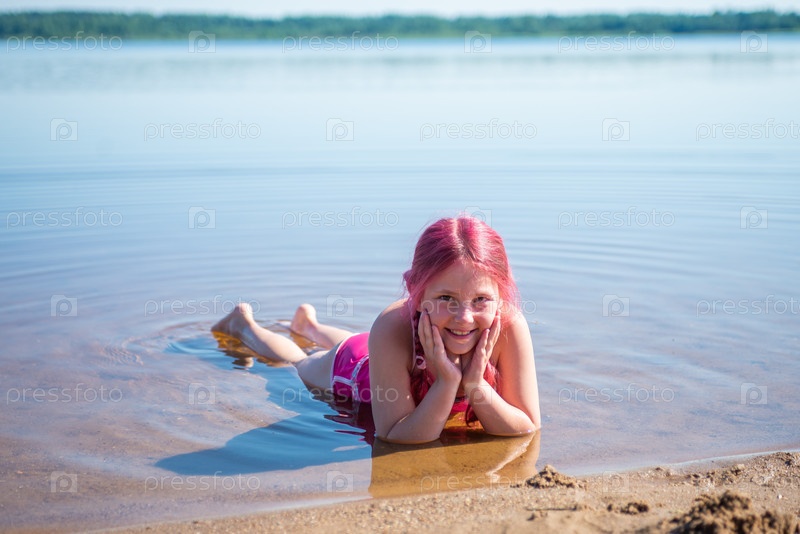 Девочка с розовыми волосами отдыхает на озере в жаркий летний день