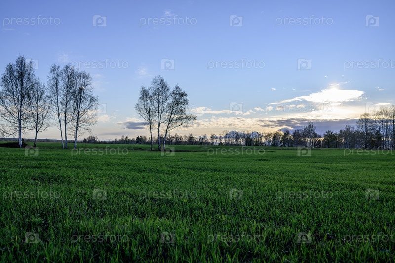 Закат над полем с деревьями и травой на переднем плане