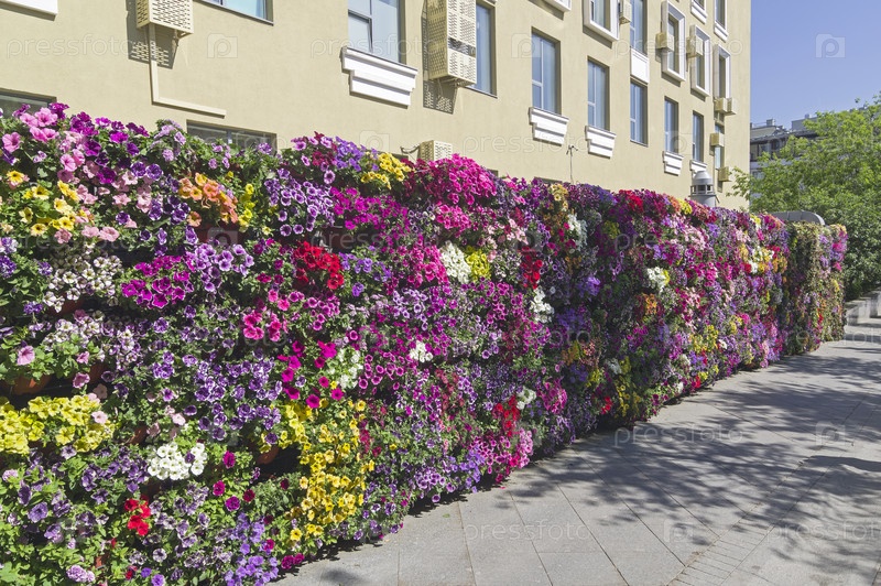 Множество горшков с разноцветной цветущей петунией, укрепленные на стене. Столешников переулок, Москва, Россия, солнечный день в конце мая