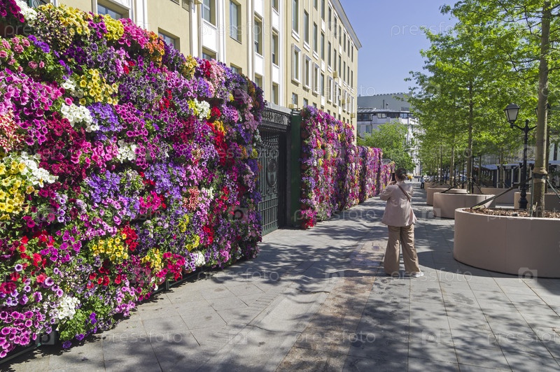 Множество горшков с разноцветной цветущей петунией, укрепленные на стене. Столешников переулок, Москва, Россия, солнечный день в конце мая