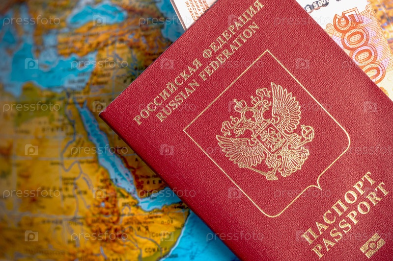 Российский загранпаспорт на фоне карты мира. Туризм