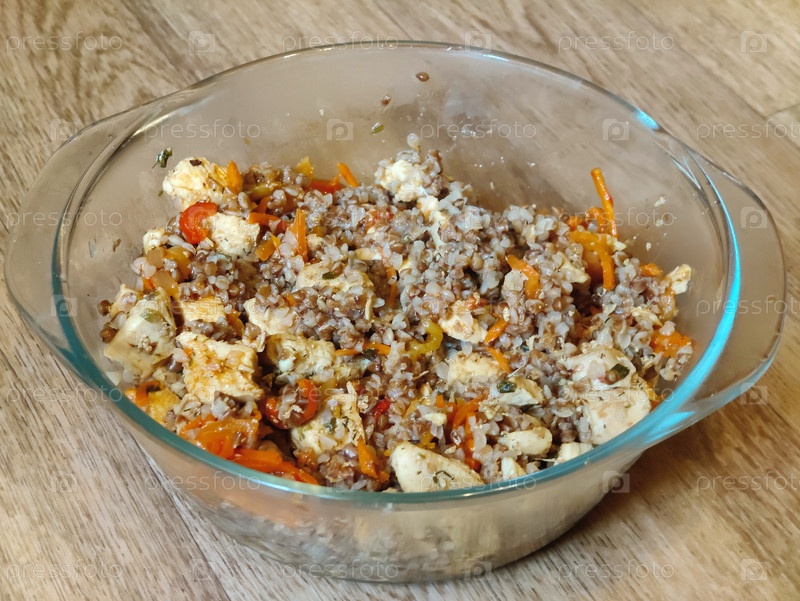 Тарелка с тушеной курицей и гречкой с овощами