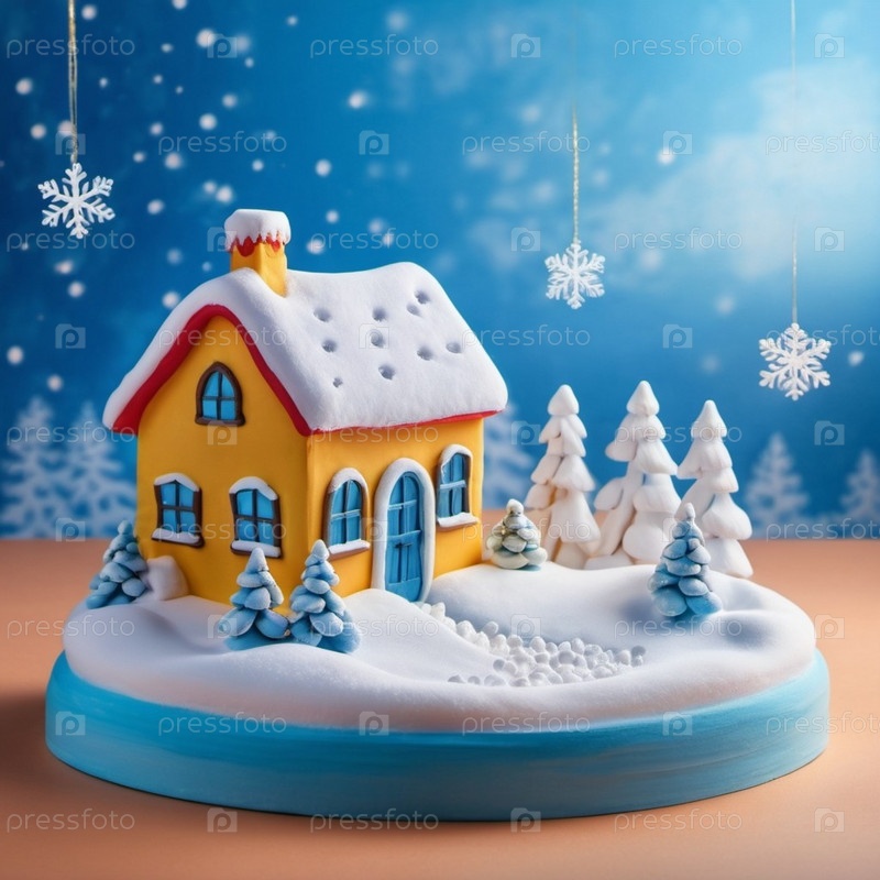 Причудливая деревня, пряничный домик, заснеженные крыши, окна и дымоход. Дом окружен снегом и снежинками. Синий фон боке. Праздничная и очаровательная зимняя страна чудес. генерируемый