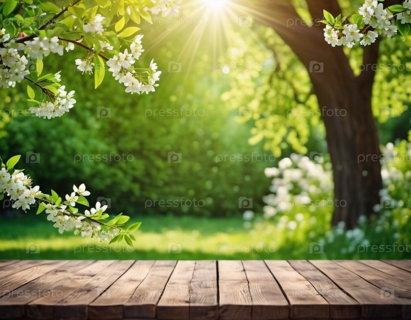 Деревянный стол сидит перед размытым фоном весеннего сада. Белые цветы на ветке достигают солнца, которое светит сквозь листву. Копирование пространства для демонстрации продукции. ИИ