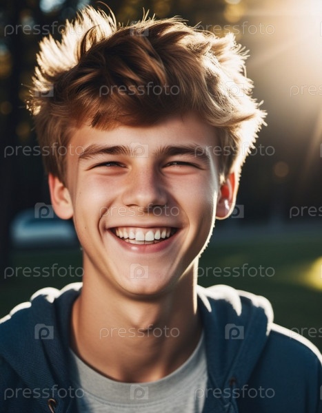 Молодой кавказец с каштановыми волосами и белыми зубами улыбается. Он стоит на улице, вероятно, в дневное время. Его лицо освещается теплым сиянием солнца, что делает его улыбку еще более сияющей