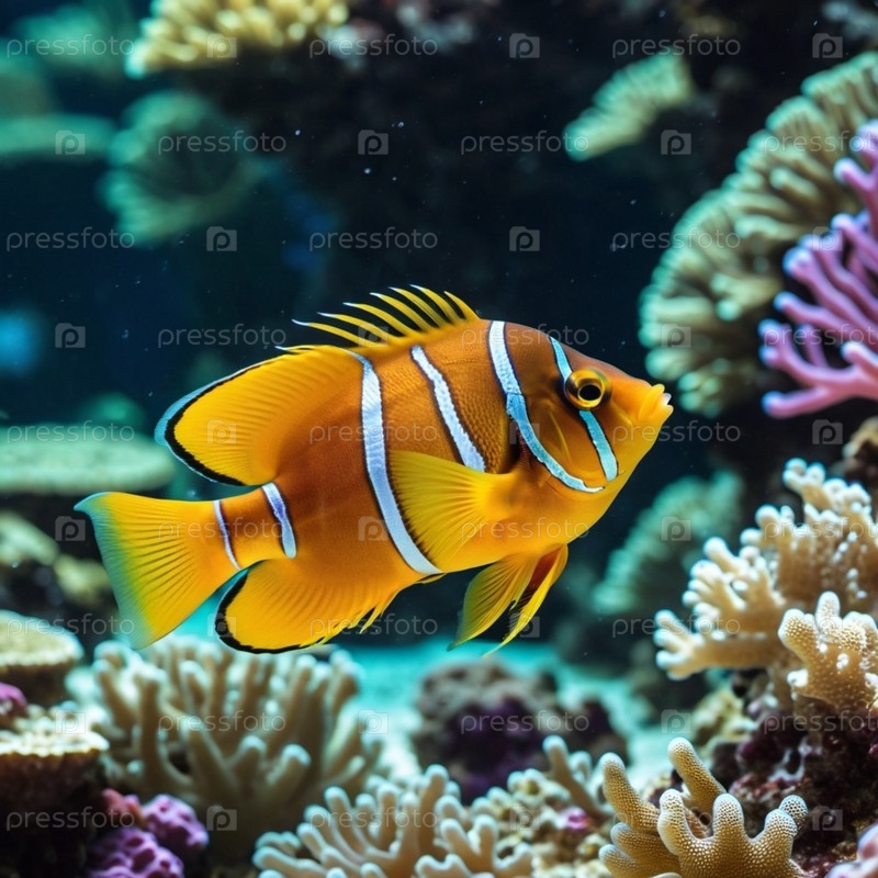 Яркие оранжево-бело-желто-красные рифовые рыбы плавают через коралловый риф. Солнечные лучи пронзают морскую воду. Разнообразие животных. Гидросфера экологии. Антропогенный фактор, влияющий на гибель коралловых рифов. ИИ