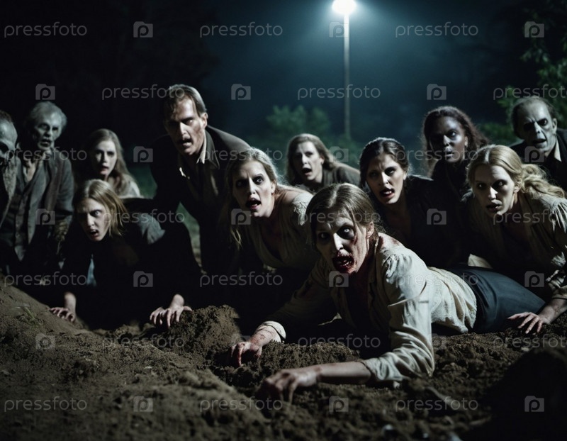 Зомби поднимаются с земли на тревожном кладбище. Безжизненные выражения, потрепанная одежда показывают преследующее прошлое. Тусклый свет создает атмосферу страха. Могилы, жуткая атмосфера, упадок и ужас. ИИ