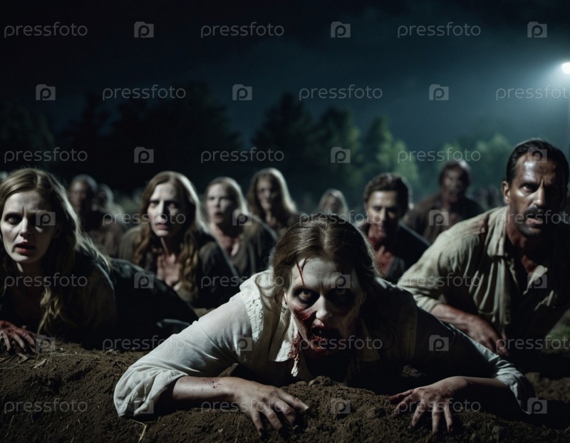 Зомби поднимаются с земли на тревожном кладбище. Безжизненные выражения, потрепанная одежда показывают преследующее прошлое. Тусклый свет создает атмосферу страха. Могилы, жуткая атмосфера, упадок и ужас. ИИ