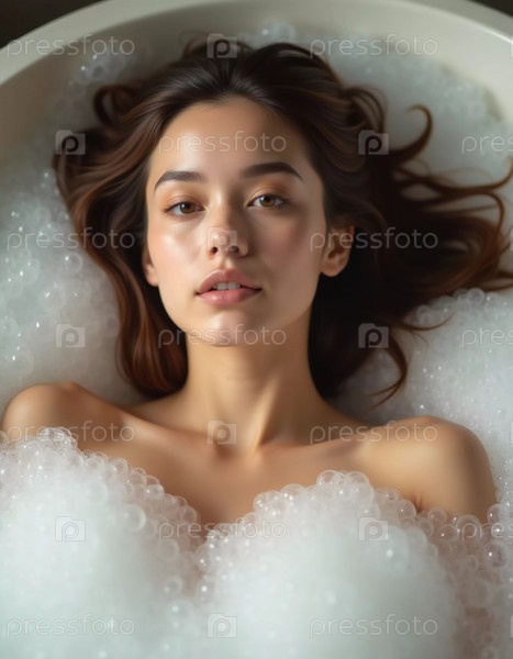 Молодая женщина с плавными волосами отдыхает в роскошной ванне, наполненной пушистой пеной, создавая спокойную атмосферу в хорошо освещенной ванной комнате во время спокойного дня