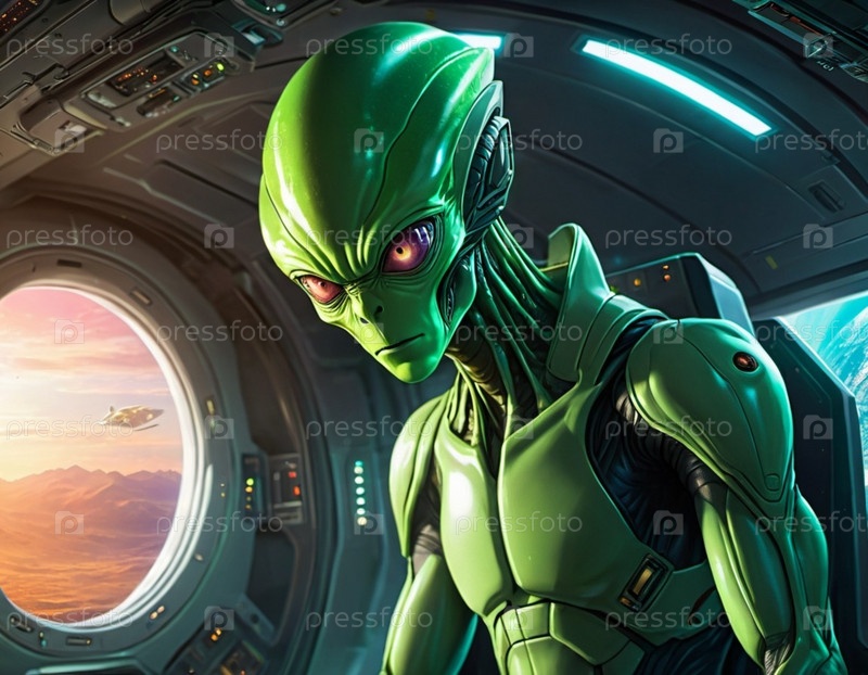 Встреча инопланетян в пустоте на борту футуристического космического корабля во время межзвездного путешествия в глубокий космос, раскрывающего таинственное существо. Генерирующий ИИ