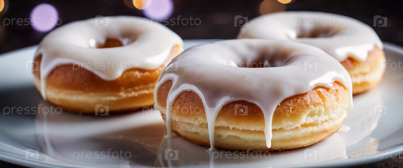 Вкусный ассортимент ванильных пончиков увенчан кремовым обледенением и красочными посыпками, демонстрирующими их привлекательную текстуру и сладость в теплой обстановке кафе. Белая глазурь на булочках. Генерирующий ИИ
