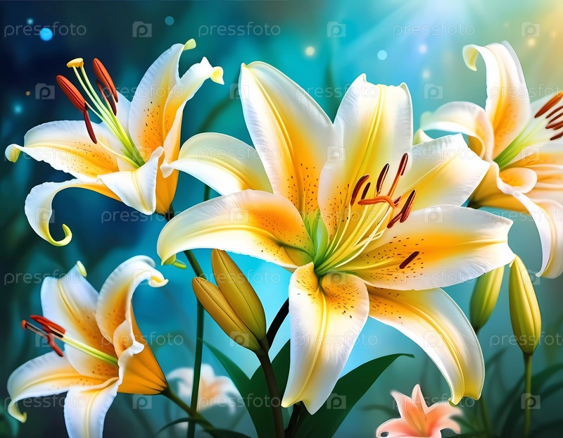 Нежные белые желто-оранжевые лилии растягивают свои лепестки широко, обрамленные светящимся сине-зеленым фоном, с мягкими боке и теплым солнечным лучом, создавая очаровательную атмосферу. Генеративный ИИ