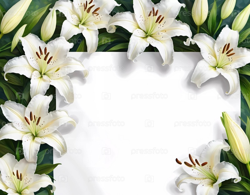 Очаровательные белые лилии с зелеными листьями создают тонкую границу вокруг пустого пространства, идеально подходящую для добавления персонализированных сообщений или дизайнов. Генеративное искусство. Копируйте место, поздравительная открытка