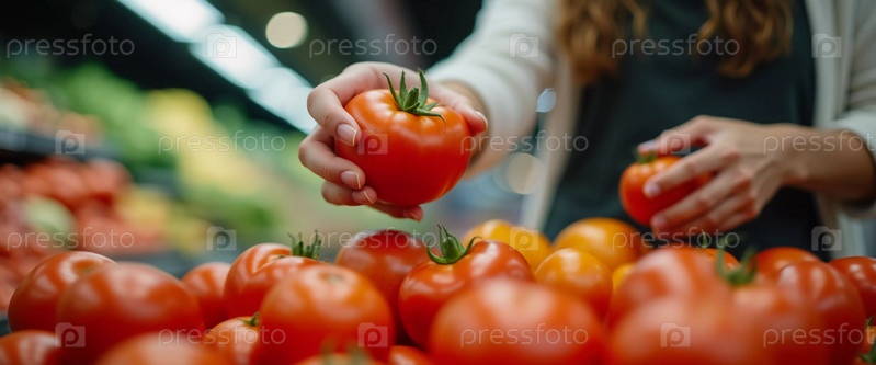 Женщина осматривает спелый помидор в руке, задумчиво сравнивая его с другими на дисплее в оживленном супермаркете, наполненном красочными фруктами и овощами. Генеративный ИИ. Покупатель в магазине