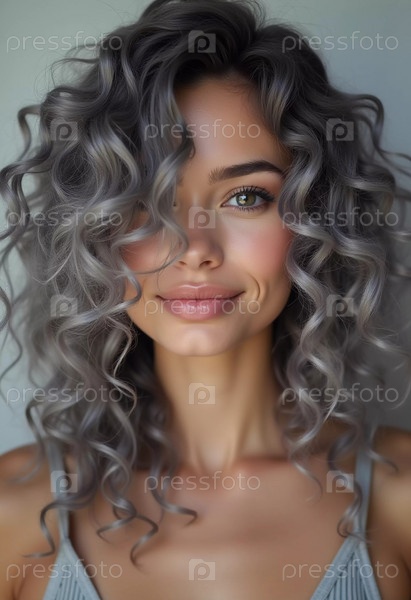 Поразительный крупный план выявляет сочные серые пепельные локоны, сверкающие блеском. Мягкие волны элегантно каскадируют, подчеркивая текстуру и красоту волос в нежном естественном свете. Генерирующий ИИ