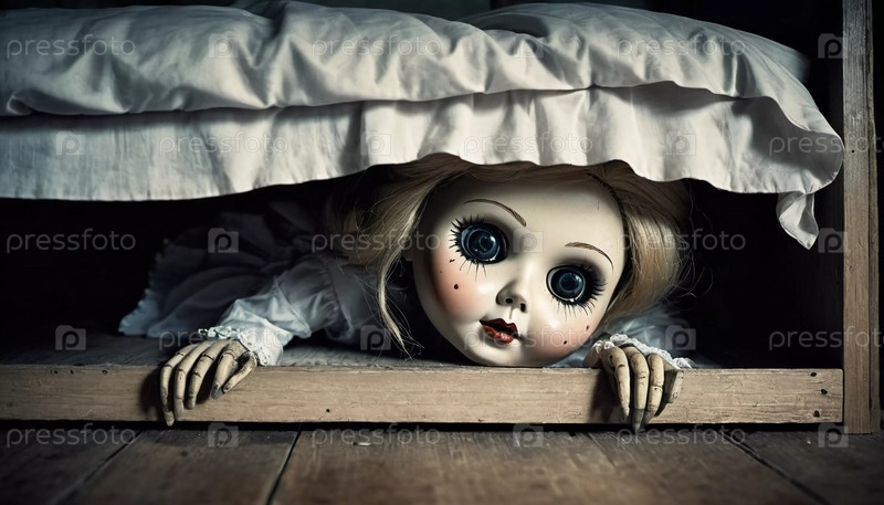 Тревожная старая кукла с преследующими глазами и винтажной одеждой выскочила из-под ретро-кровать, вызывая жуткое чувство в тускло освещенном пространстве. Страшная кукла для ужасов и Хэллоуина. Генеративный ИИ