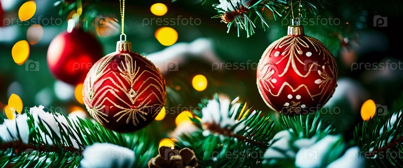 Красочные рождественские украшения украшают ветви елки, яркие шары в оттенках красного и розового, олицетворяющие праздничное настроение зимой. С Новым годом искусство боке фон. Генеративный ИИ