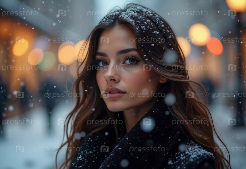 Потрясающая женщина смотрит мягко, когда вокруг нее падают снежинки в восхитительной городской обстановке, захватывая магию рождественского сезона. Красивая брюнетка с длинными волосами. Генерирующий ИИ