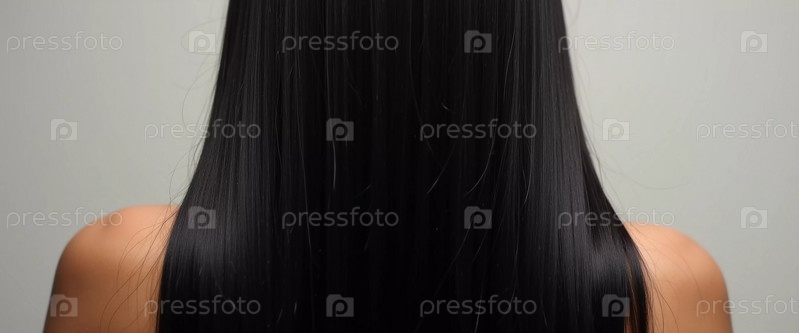 Гладкие, прямые черные волосы изящно текут внизу, подчеркивая его здоровый блеск и однородный цвет, освещенный мягким освещением, создавая поразительный вид. Уход за волосами, эффект косметики. ИИ