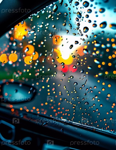 Капли дождя цепляются за поверхность автомобильного стекла, искажая яркий городской пейзаж вечером, где красочные огни от движения и зданий сливаются в красивый дисплей. Генерирующий ИИ
