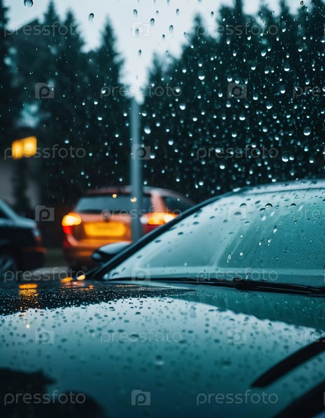 Капли дождя цепляются за поверхность автомобильного стекла, искажая яркий городской пейзаж вечером, где красочные огни от движения и зданий сливаются в красивый дисплей. Генерирующий ИИ