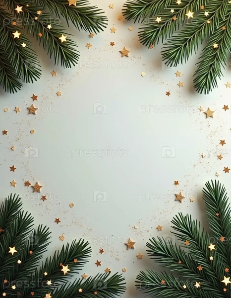 Ветви елки создают праздничную границу, с разбросанными золотыми звездами и огнями, усиливая радостную атмосферу празднования Рождества и Нового года, вызывая тепло и веселье. Генерирующий ИИ
